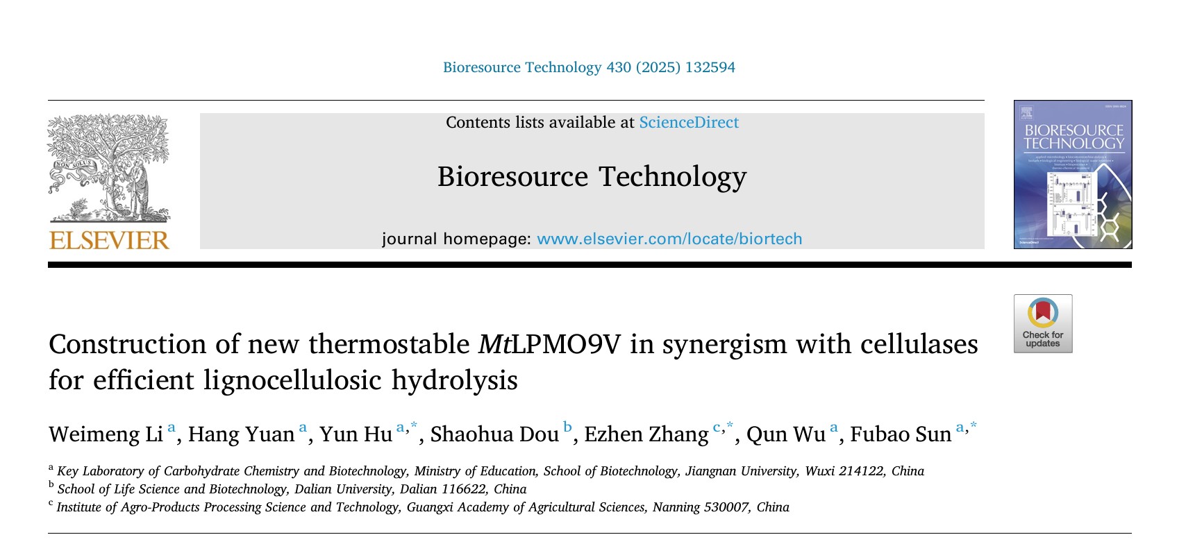 近期,365官网Beat365唯一官方网站生物资源与生物炼制孙付保教授团队通过对AA9家族LPMO酶进行挖掘与改造,在提升纤维素水解效率方面取得重要进展,研究成果“Construction of new thermostable MtLPMO9V in synergism with cellulases for efficient lignocellulosic hydrolysis”正式发表于Bioresource Technology(一区, Top, IF 9.7)。