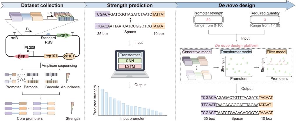 近年来,人工智能方法逐渐应用于转录调控研究,但多数依赖于边界模糊的基因组序列,难以严格界定功能区段;或依赖于转录组学水平的间接信号(如RNA表达量),而这些并不能真实反映启动子的转录活性。由此导致预测结果与实际功能之间常常存在偏差,难以支撑高精度的理性设计,尚不能满足合成生物学对可编程基因表达调控的迫切需求。
