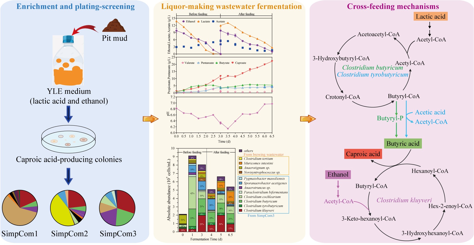 近日,徐岩教授团队任聪副研究员在利用厌氧发酵技术处理酿酒废水制备己酸方面取得重要进展,研究结果“Constructing simplified microbial consortia that couple lactic acid and ethanol utilization to highly produce caproic acid from liquor-making wastewater”正式发表于Water Research (自然指数杂志,IF=12.4) (https://doi.org/10.1016/j.watres.2025.123973)。该团队创新采用 “Top-down” 厌氧微生物群落构建策略,从浓香型白酒窖泥中筛选出高效产己酸的简化微生物群落,成功将酿酒废水中的可降解碳转化为高价值中链脂肪酸 —— 己酸,为酿酒废水资源化利用与低碳生物炼制提供了重要解决方案。