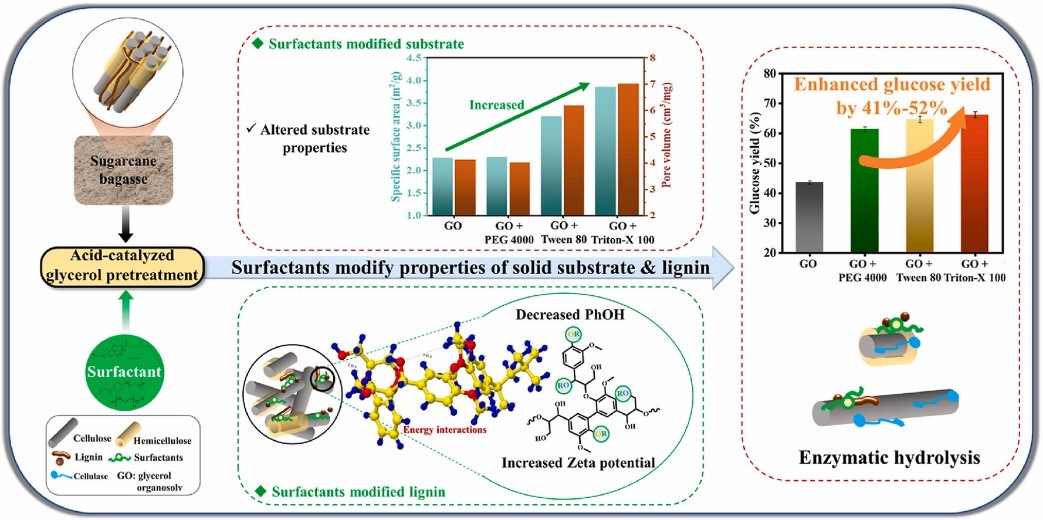 针对上述问题,孙付保教授团队在酸催化甘油有机溶剂预处理体系中引入表面活性剂(PEG 4000、Tween 80、Triton X-100),以期通过表面活性剂作用强化组分分离选择性及其底物后续酶解产糖性能。实验结果表明,三种表面活性剂均可显著提高底物可酶解性,葡萄糖产率增幅达25%以上。深入分析发现,在预处理中添加某些表面活性剂(Tween 80和Triton X-100),可明显降低体系表面张力,便于溶剂和催化剂渗透至底物内部,从而促进生物质原料解构和组分选择性分离,尤其强化了半纤维素去除,并使底物的比表面积和孔容显著提高(40%–70%)。另一方面,研究发现表面活性剂可与木质素发生醚化接枝反应,使木质素的表面负电荷显著增加,同时其脂肪族羟基和酚羟基含量明显降低。尤其是,PEG 4000通过接枝作用有效提升了木质素的亲水性。最后,相关性分析揭示了“底物物理结构改善”与“木质素化学修饰”对底物酶解性能提升的相对贡献,其中由表面活性剂引发的木质素修饰作用占据主导地位。这为构建经济、高效的新型预处理方法提供了新的思路。
