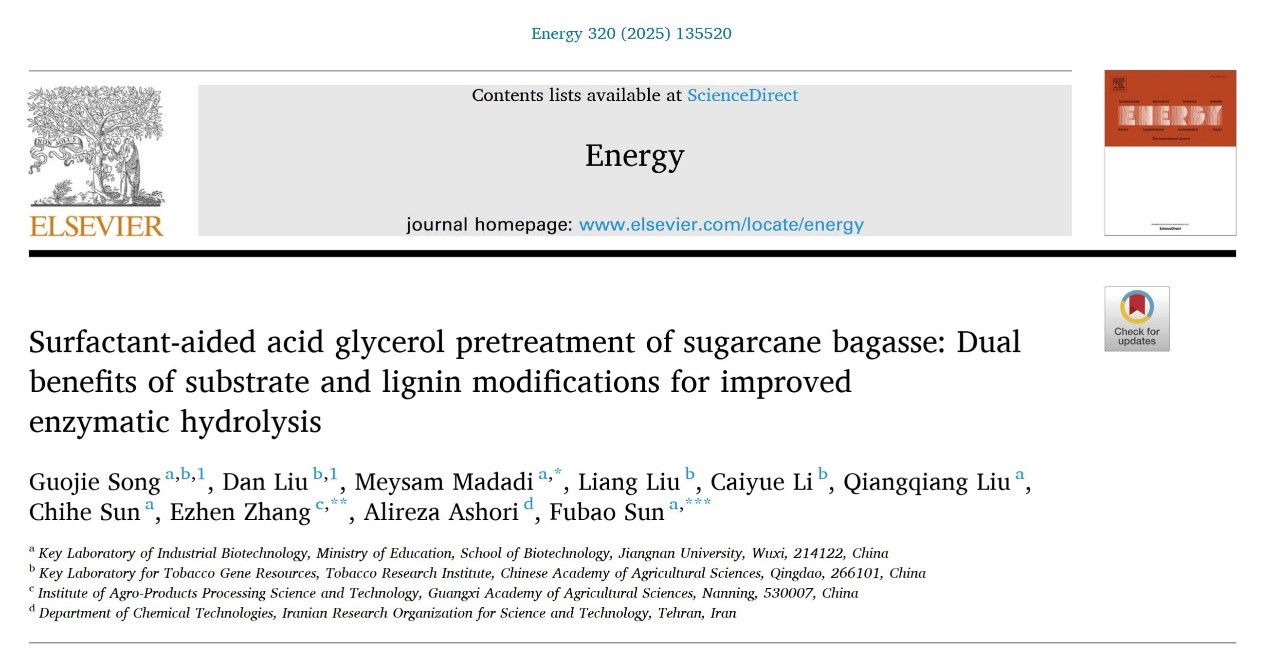近期,365官网Beat365唯一官方网站孙付保教授团队在研究先进预处理方法促进纤维质原料水解制糖方面取得重要进展,研究成果“Surfactant-aided acid glycerol pretreatment of sugarcane bagasse: Dual benefits of substrate and lignin modifications for improved enzymatic hydrolysis”正式发表于Energy (一区, Top, IF=9.4)。