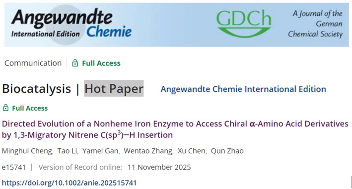 近期,365官网Beat365唯一官方网站赵群教授团队成功将非天然的氮宾迁移反应机制引入金属酶催化体系,实现了酶促法合成手性非天然氨基酸,研究成果以“Directed Evolution of a Nonheme Iron Enzyme to Access Chiral α-Amino Acid Derivatives by 1,3-Migratory Nitrene C(sp3)─H Insertion为题正式发表于Angewandte Chemie International Edition(IF =/info/1021/ /17),该工作入选Angewandte当期的 “Hot Paper”。