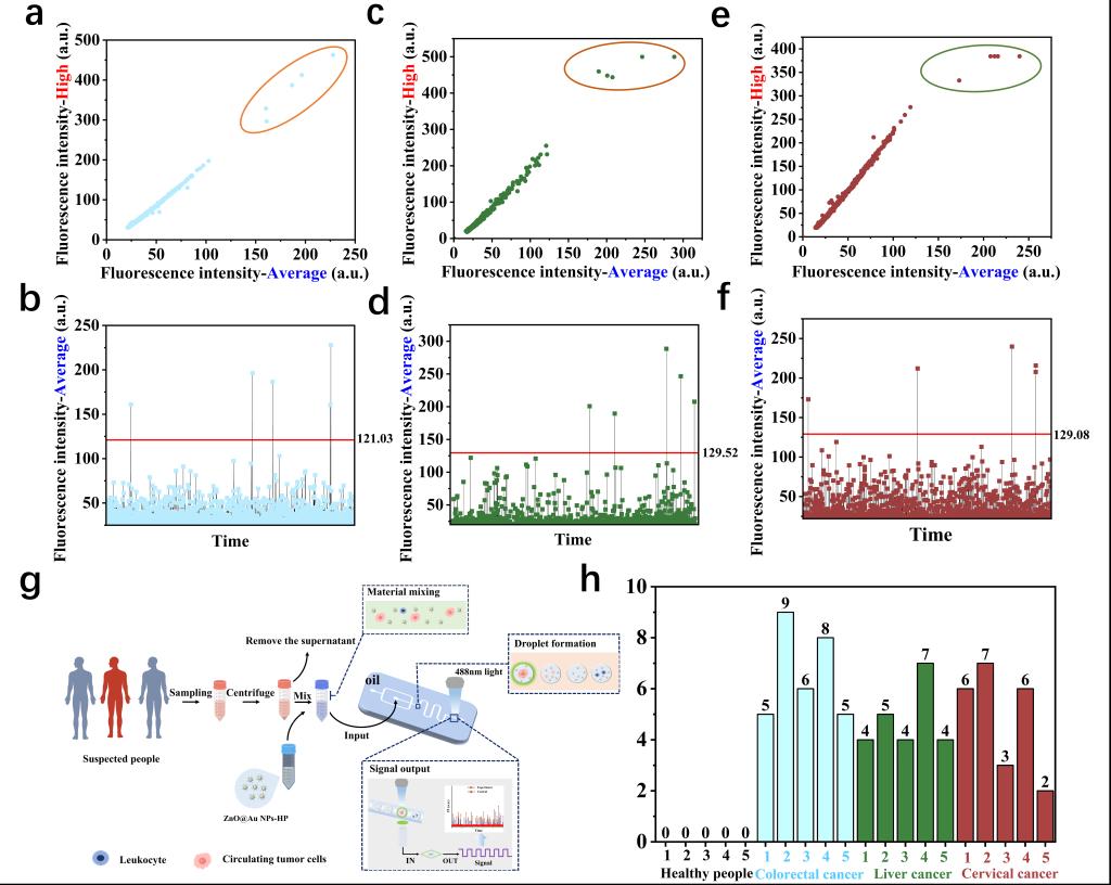 为评估所构建的集成纳米荧光探针与液滴技术传感器的检测性能,研究团队首先在血液样品中分别掺入三种不同种类的CTCs (HCT116、HepG2和HeLa)各5个进行加标检测。以HCT116细胞为例,传感器能够稳健地从复杂样品中检测出5个高荧光液滴(图2a),且其荧光强度值均显著高于预设的检测阈值(图2b)。在HepG2(图2c-d)与HeLa(图2e-f)细胞的检测中,均观察到一致的高效检出与荧光信号特征。上述结果表明,该传感器在多种CTCs模型的血样检测中均表现出优异的稳健性与可靠性。