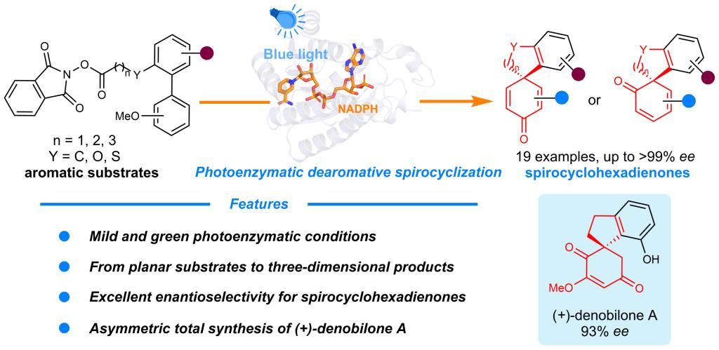 本研究构建了一种新颖的光酶催化去芳构化反应平台,结合可见光活化与工程化的烟酰胺依赖性酮还原酶(KRED),成功实现了非天然生物催化去芳构螺环化反应(图1)。首先,在建立光激发酶催化不对称合成螺环己二烯酮体系的基础上,通过对KRED进行半理性设计,有效缓解了活性位点的空间位阻,从而以高产率与高对映选择性合成了一系列手性螺环己二烯酮类化合物,包括具有合成挑战性的邻螺环己二烯酮,并展现出良好的官能团耐受性。进一步结合控制实验与分子对接模拟,本研究提出了合理的反应机理,阐释了立体选择性产生的根源。此外,该方法成功应用于天然产物(+)-denobilone A的首次不对称全合成,以93%的ee值获得目标分子。本工作不仅为复杂手性螺环骨架的绿色合成提供了新途径,也为拓展非天然光酶催化反应库提供了新思路。