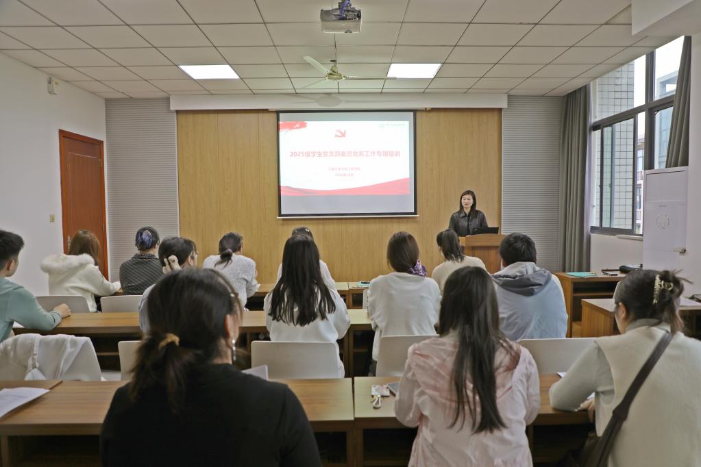 陆燊佳做党建工作实务培训,她介绍了学院学生党建基本概况,并围绕发展党员工作流程、智慧党建平台网上党支部管理、党支部工作手册填写规范、党费收缴与使用等进行了详细讲解,希望全体支委将培训内容转化为工作实效,以良好的党务工作能力、饱满的工作热情投身党建工作。